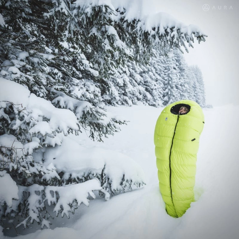 Le AR 450/800 d’Aura est un sac de couchage garni de 450 grammes de duvet d’oie polonais de qualité, de 800 cuin. Le duvet est réparti dans des compartiments en forme de H afin de limiter les déperditions thermiques. Il ne dispose pas d’une forme momie classique, mais d’une forme en trapèze. Grâce à cela et à sa coupe standard, il offre un bon rapport entre le poids et la température de confort. Sa fermeture éclair sur le devant permet une plus grande liberté de mouvement, pour manger tout en restant au chaud par exemple.