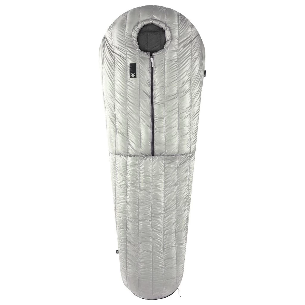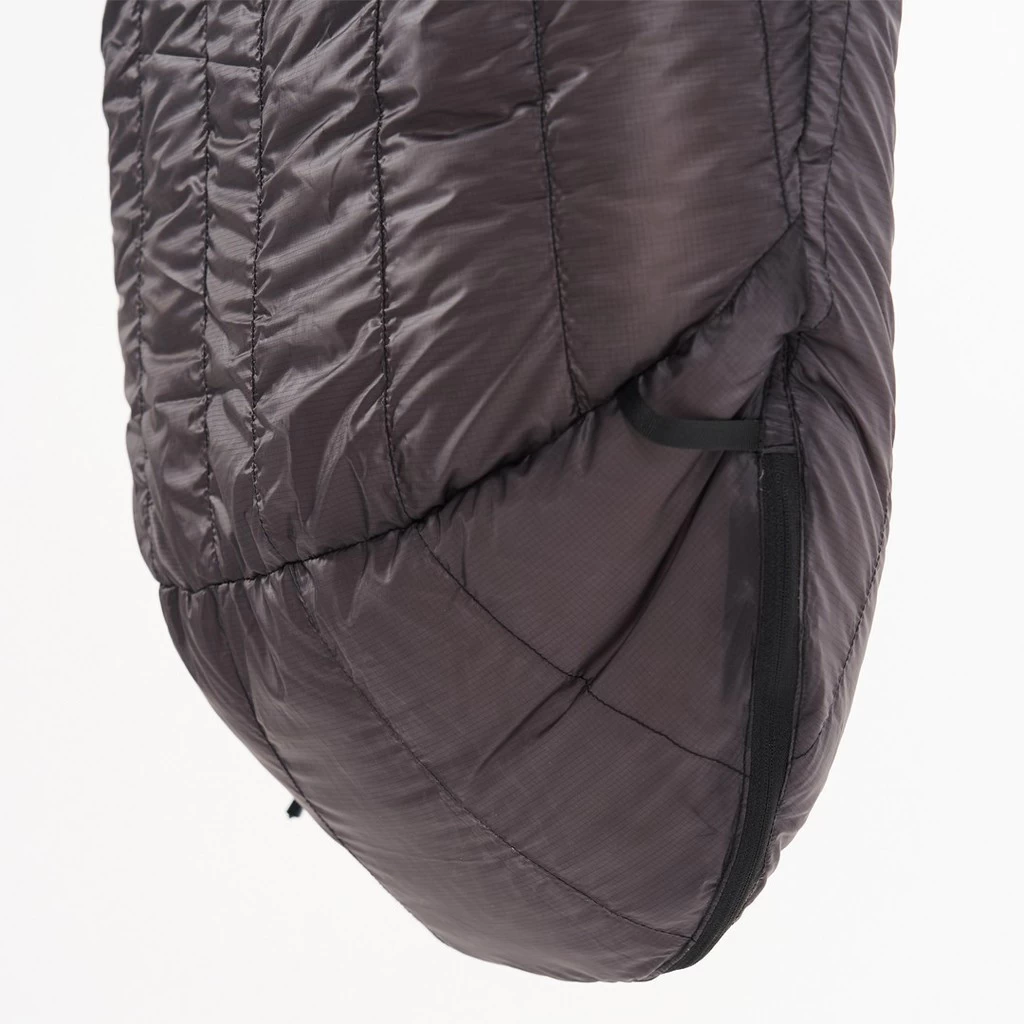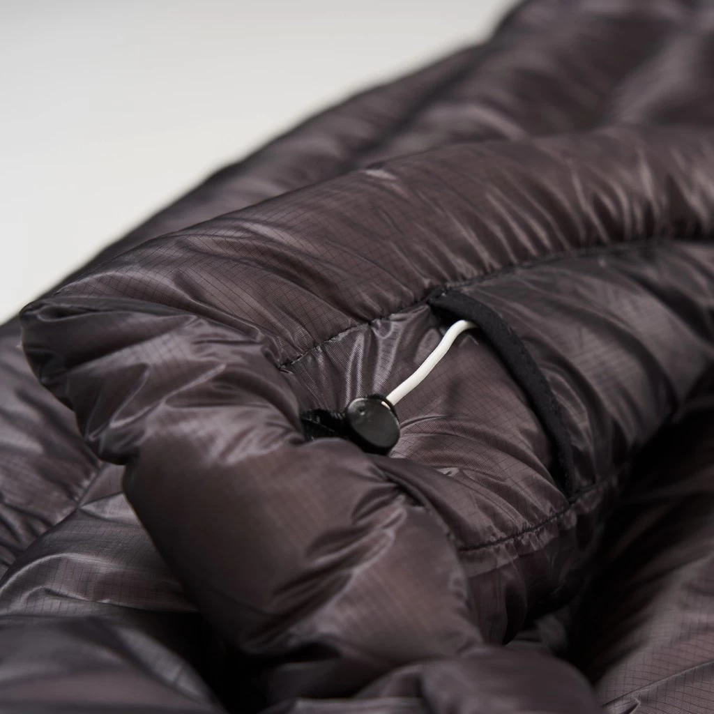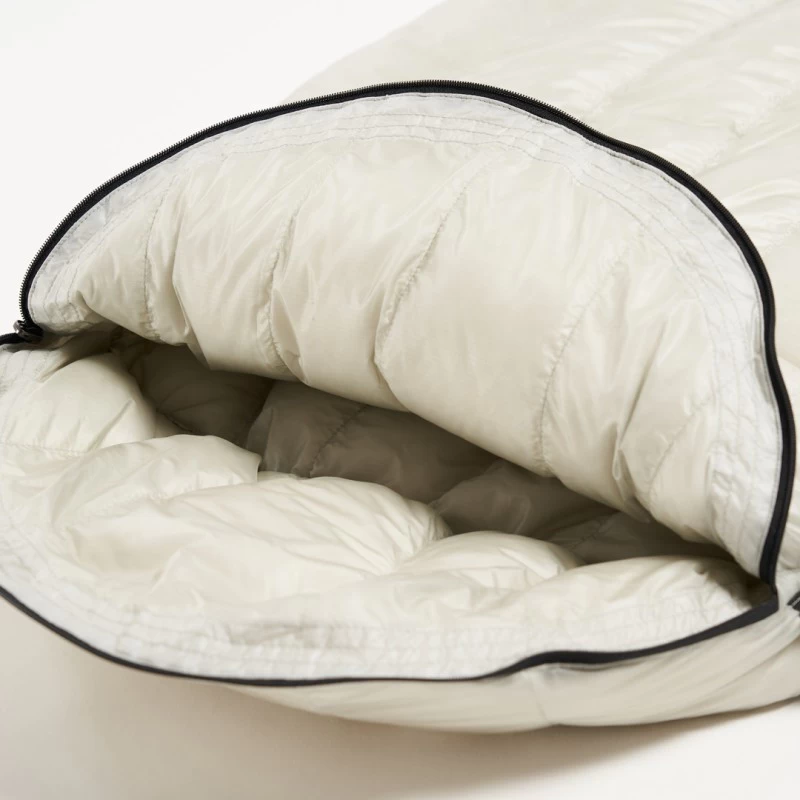 Son garnissage est constitué de 200 grammes de duvet d’oie polonais de haute qualité, 860 cuin. Celui-ci est réparti dans des compartiments en forme de H afin de limiter les déperditions thermiques. Sa demi-fermeture éclair est courte afin de limiter également les déperditions. Située sur le devant, elle permet d’avoir une grande liberté de mouvement, pour manger tout en restant au chaud par exemple. Une seconde fermeture éclair est située au niveau des pieds, pour assurer la ventilation lorsqu’il fait chaud.