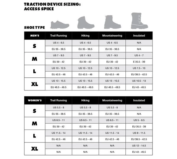 Les Access Spike de Black Diamond sont des crampons souples anti-dérapants équipés de 14 pointes en acier offrant une adhérence optimale sur la neige, le verglas et les zones gelées. Grâce aux Access, vous pourrez marchez sur la neige en toute confiance. Ils sont aussi conçus pour la randonnée sur sentier et le trail.