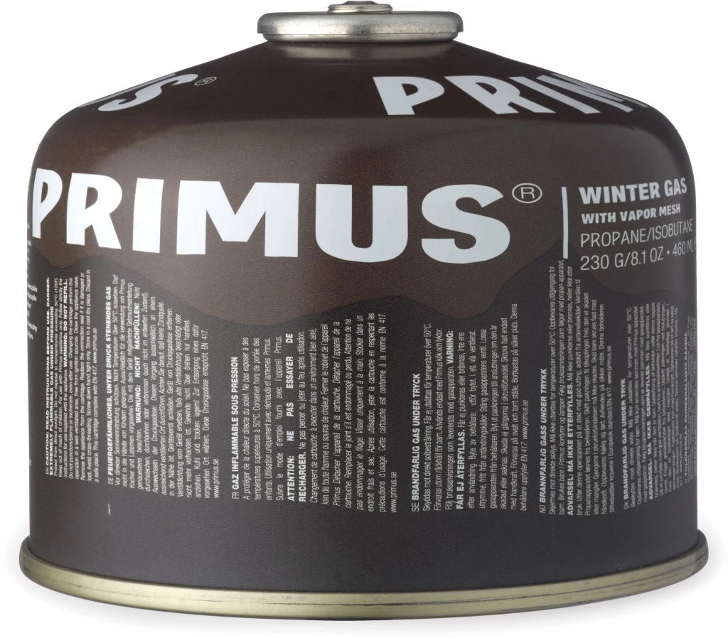 Cartouche de gaz Winter Gaz 230 grammes de Primus. Gaz spécifique utilisable jusqu’à -22°C.