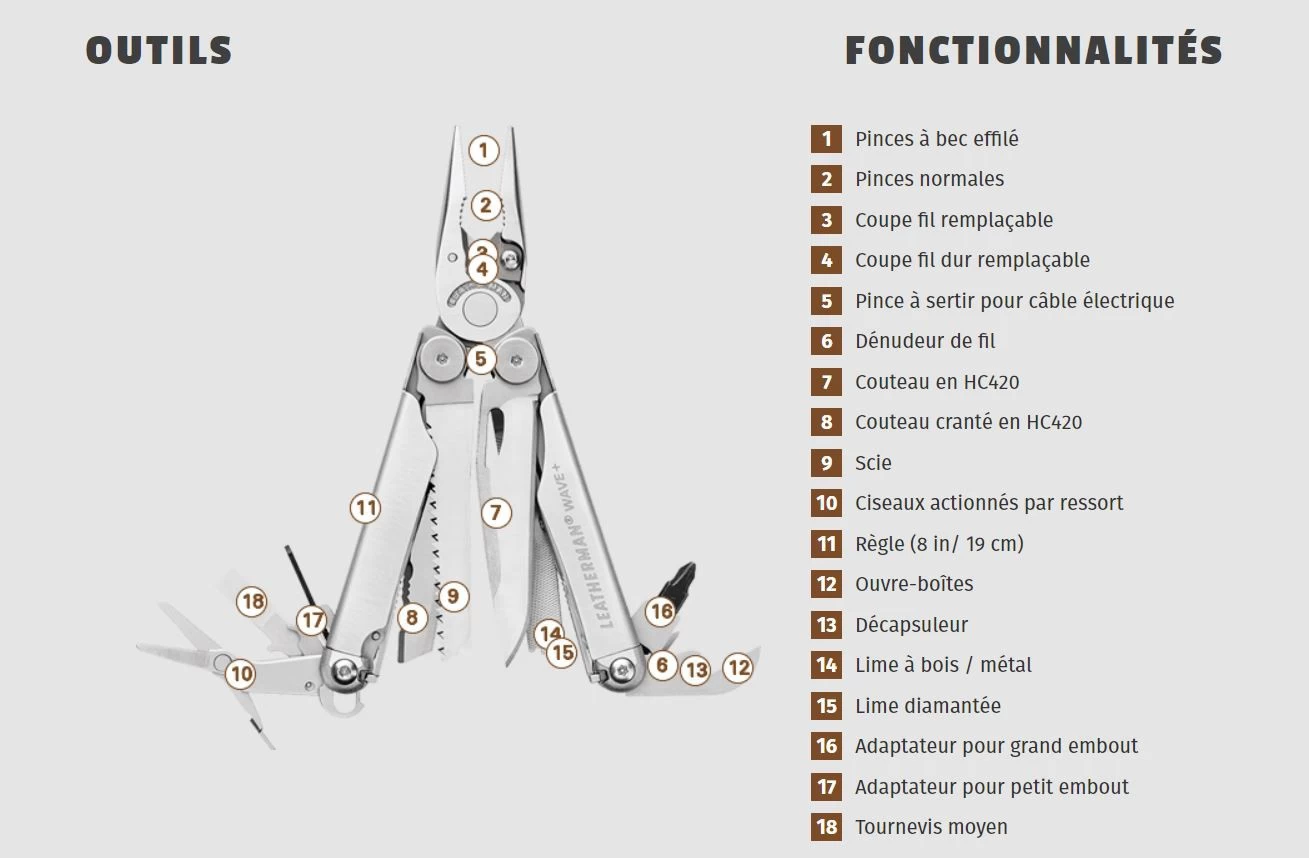 Le Wave+ est une rĂ©fĂ©rence chez Leatherman. Il sâagit dâun modĂšle extrĂȘmement populaire et cela est liĂ© au fait que cette pince multifonction soit trĂšs complĂšte et robuste. Cet outil est fabriquĂ© en acier inoxydable. Il comprend 18 fonctions.