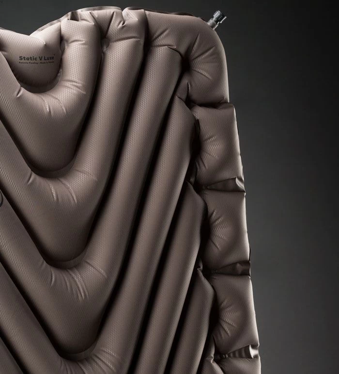Les boudins en forme de V limitent la circulation de l’air afin de minimiser les pertes de chaleur. Ils répartissent le poids du dormeur sur le matelas. Les boudins latéraux empêchent que le dormeur glisser sur les côtés et lui permet de rester au centre du matelas. La forme s’adapte à de multiples types de sac de couchage et de tailles.