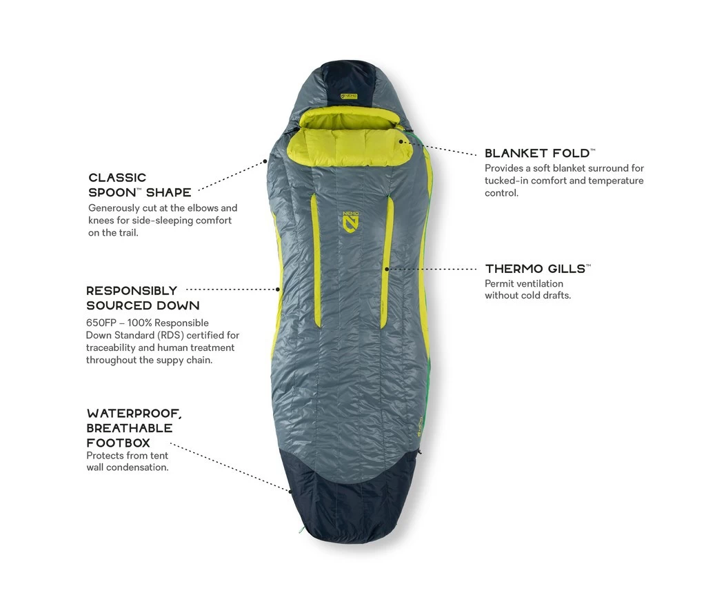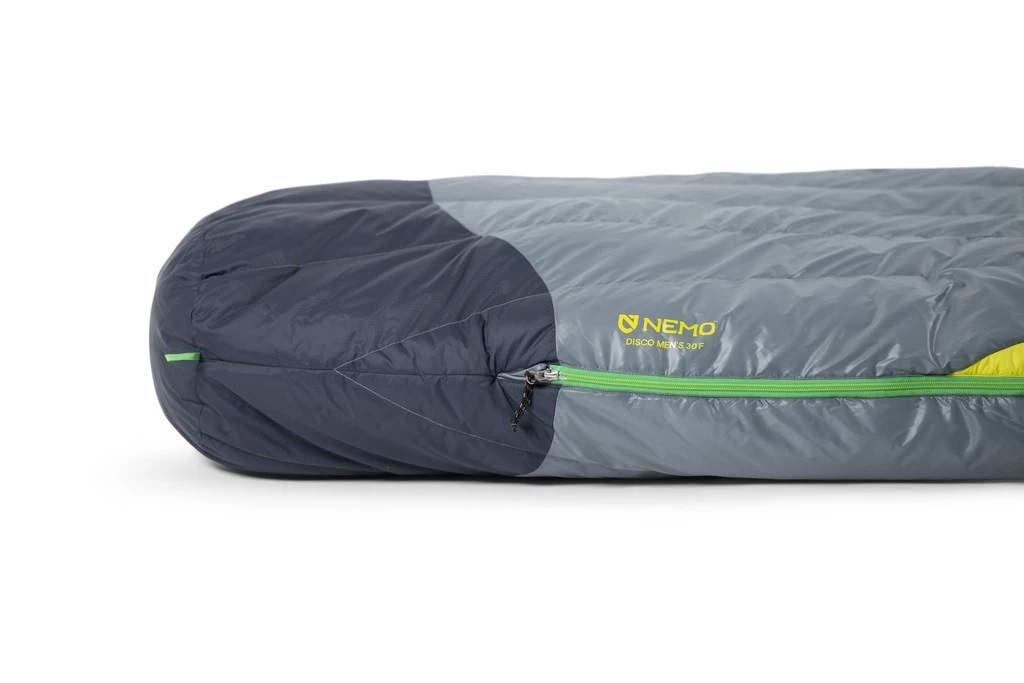 Sac de couchage en duvet de canard 650 cuin. Forme « cuillère » assurant une grande liberté de mouvement : assis /couché sur le coté / couché sur le ventre.