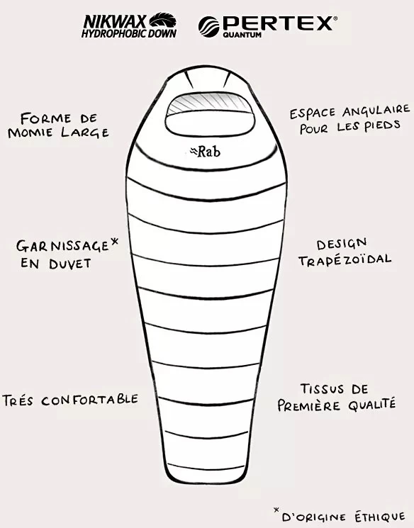 Le sac de couchage Ascent 500 Women’s de Rab contient du duvet de canard européen hydrophobe certifié RDS de 650 cuin. Sa coupe et sa taille ont été spécialement adaptées à la morphologie féminine avec une largeur aux épaules un peu plus étroite et une taille de hanches un peu plus large par rapport au modèle standard, pour des femmes mesurant jusqu’à 170 centimètres.