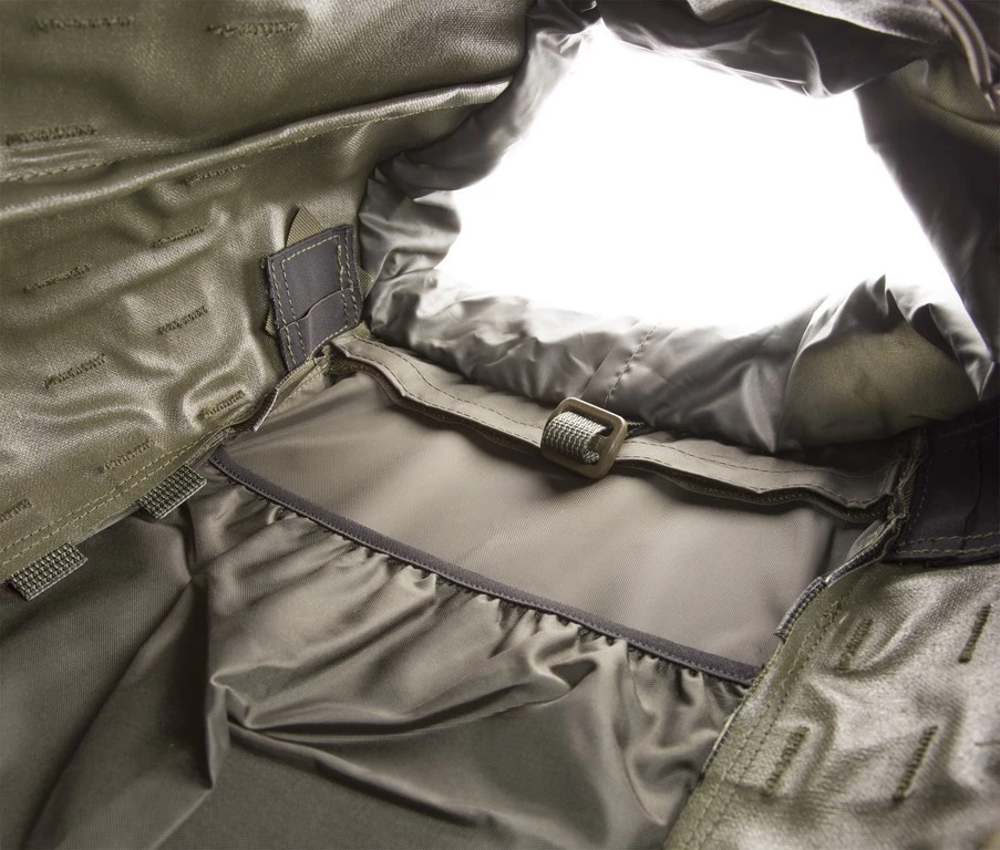 Il est équipé d’une grande poche principale. L’ouverture du sac est fermée par un cordon et sécurisée par un collier de protection imperméable. L’ouverture est recouverte d’une rabat qui épouse le haut du sac et qui se ferme par deux sangles. Le rabat est fixé avec des sangles réglables des deux côtés de sorte qu’il « flotte » et permet un suremballage facile. Si nécessaire, la longueur des sangles fournit plus d’espace sous le rabat permettant par exemple de glisser du matériel supplémentaire : un sac de couchage ou un matelas.