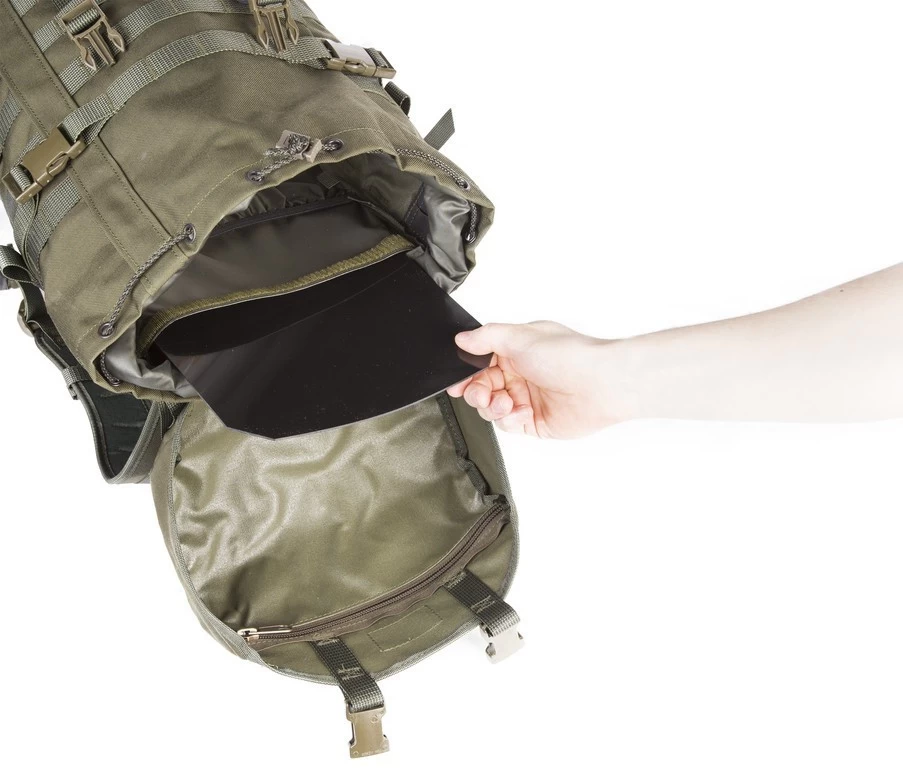 Contre et à l’intérieur du sac à dos, il y a un compartiment qui contient le cadre de soutien du sac à dos. Ce cadre est une plaque en feuille plastique éthylène qui offre une structure rigide au système de portage. Grâce à ce cadre léger, le sac à dos reste droit et reste confortable à porter avec une charge lourde. Si besoin, ce cadre peut être retiré du sac à dos.
