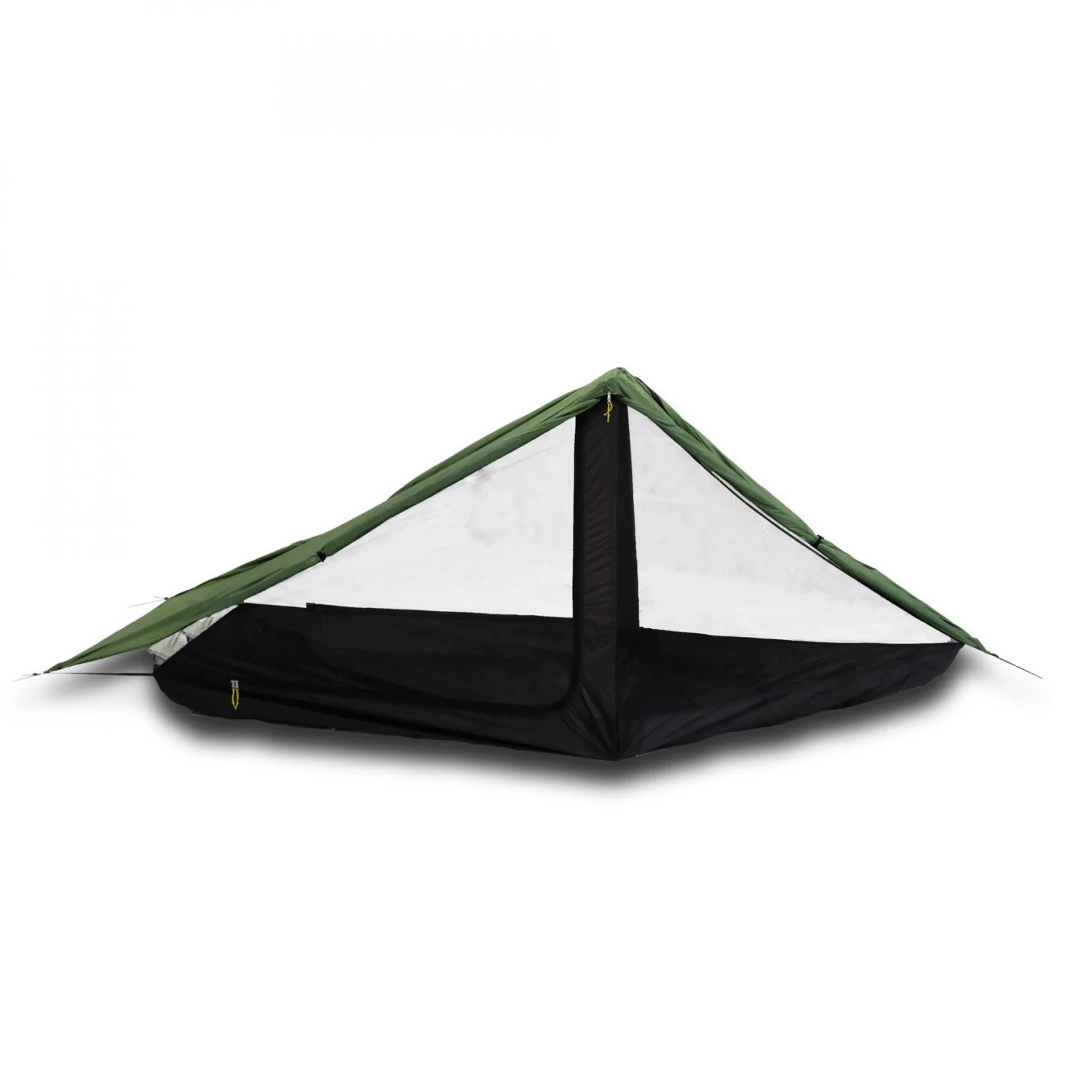 Six Moon Designs propose avec sa tente monoplace Skyscape Scout, une version économique de la Skyscape Trekker. Il s’agit de la même tente qui a la grande particularité de se monter à l’aide de 2 bâtons de randonnée, ou 2 mâts (vendu séparément) si vous n’en avez pas. Cela offre l’avantage d’économiser du poids et d’avoir moins d’équipement à transporter. La différence se joue au niveau des matériaux. La Skyscape Scout utilise un Polyester 190T enduit de polyuréthane, un tissu technique plus économique, mais un peu plus lourd que le nylon. La tente est mono-paroi sur le dessus et double-paroi sur les côtés.