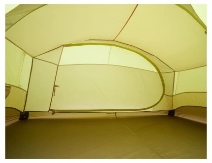 La chambre intérieure est équipée d’une grande porte en D. La ventilation est assurée par la pigeonnière située sur le haut de la toile de tente et par les bords légèrement relevés du double-toit.